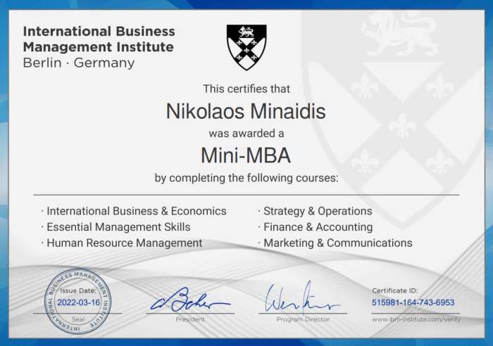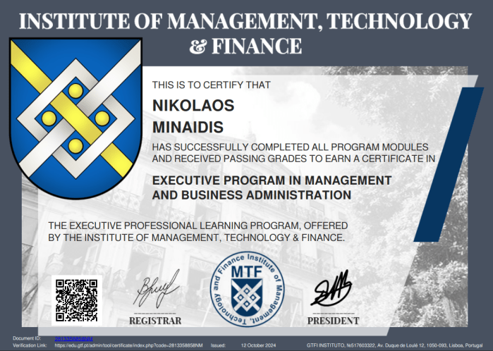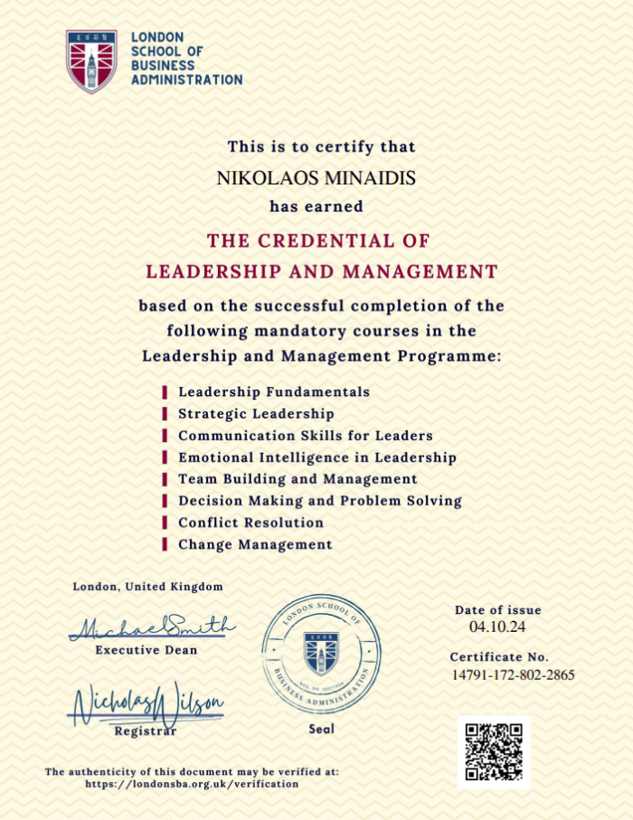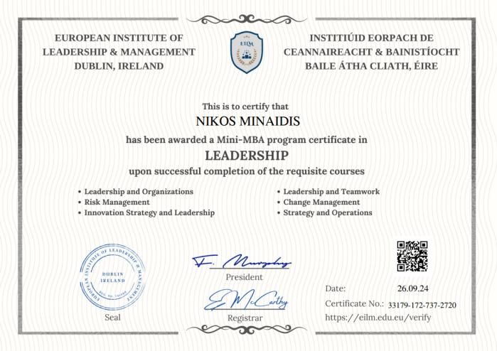 - Mini-MBA in Leadership at European Institute of Leadership and Management