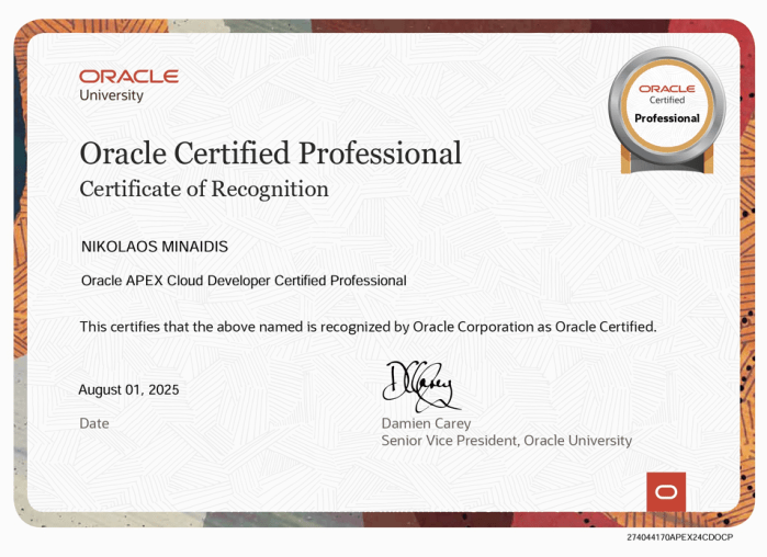 - Oracle APEX Cloud Developer Certified Proffessional (OCP)